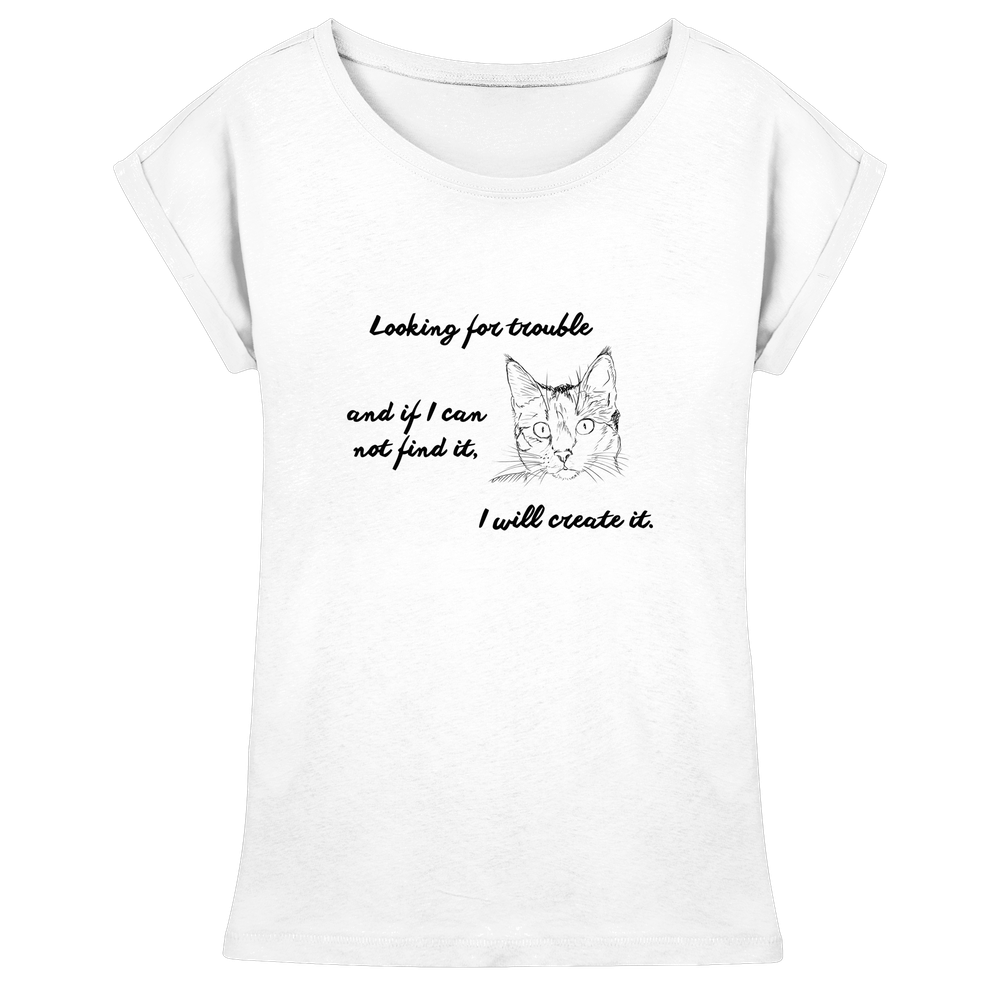 Du liebst Katzen, ihren eigenwilligen Charakter und ihren unverwechselbaren Humor? Dann ist das Damen T-Shirt Katzen „trouble“ weiß genau das Richtige für dich. Dieses stylische T-Shirt verbindet modernes Design mit einer klaren Botschaft: „looking for trouble and if I can not find it, I will create it“. Das schwarze Printmotiv mit der Katze bringt augenzwinkernd zum Ausdruck, was echte Katzenfans längst wissen – Ärger findet uns nicht, wir erfinden ihn selbst 😼.