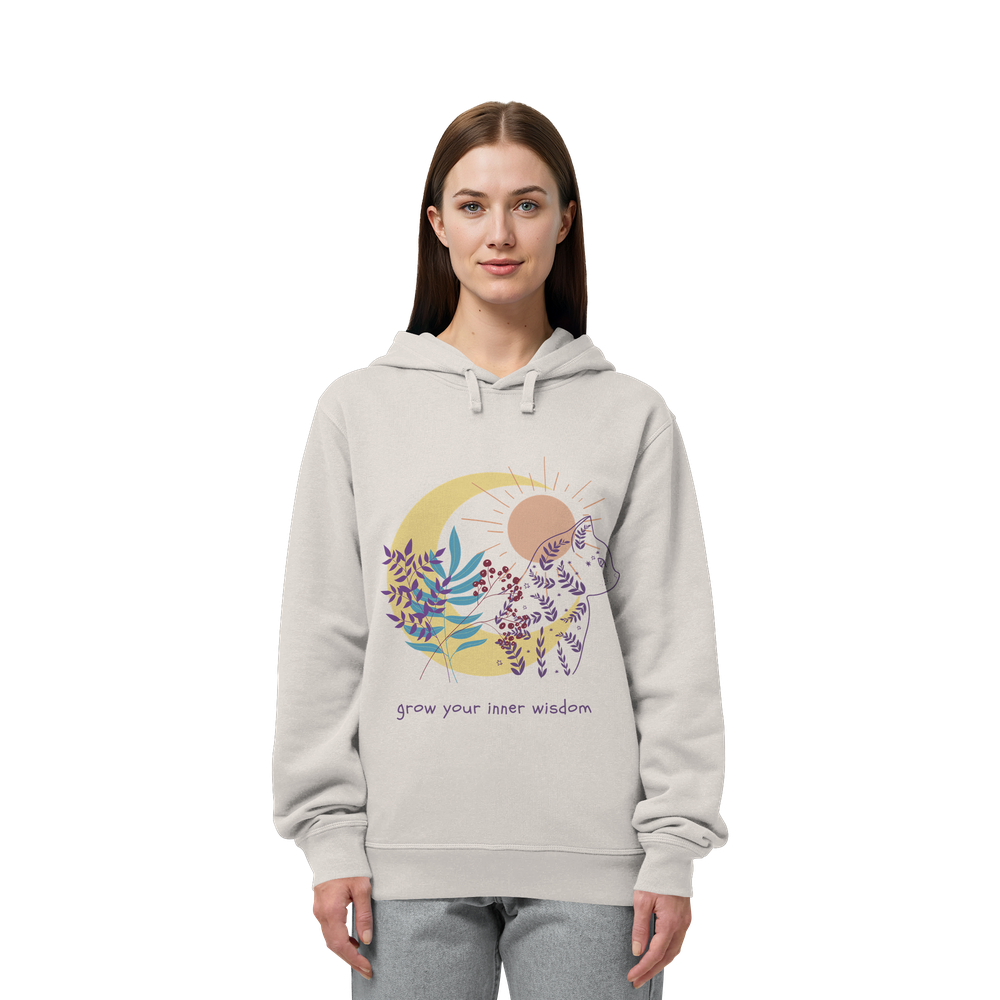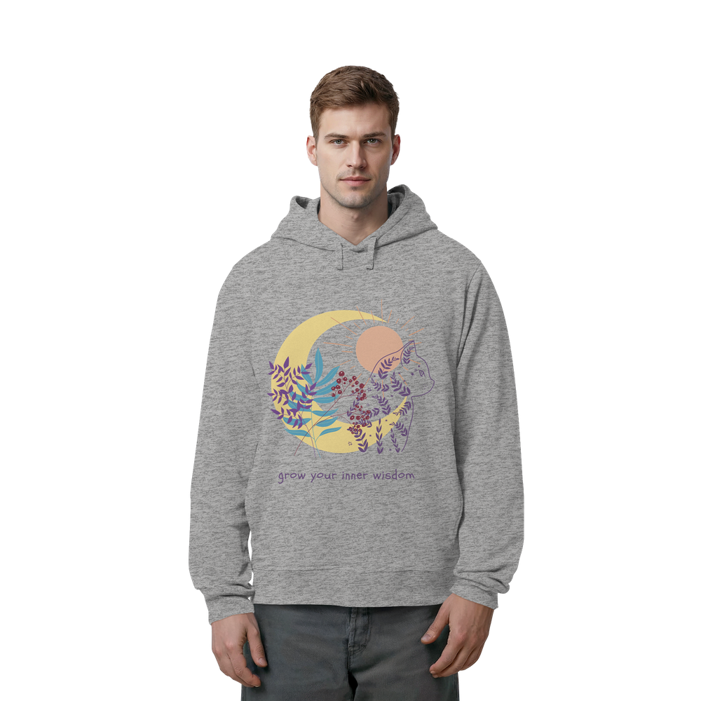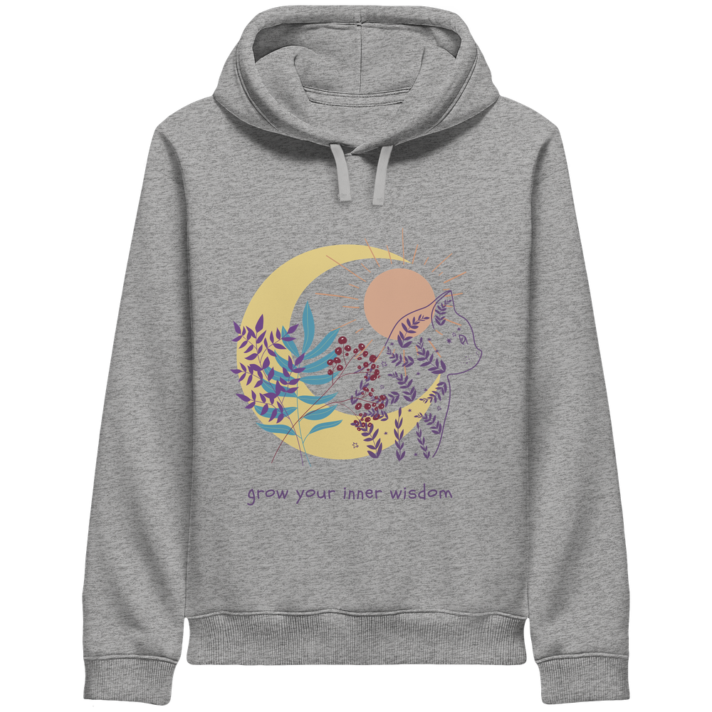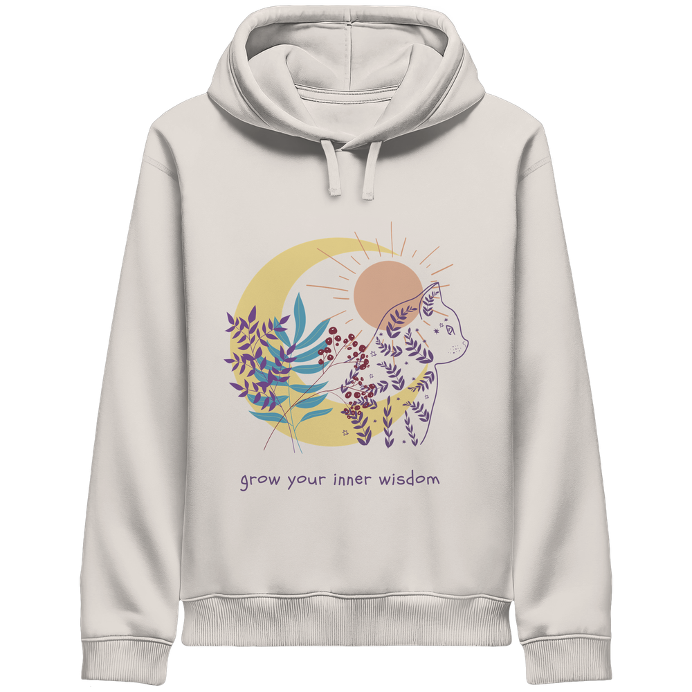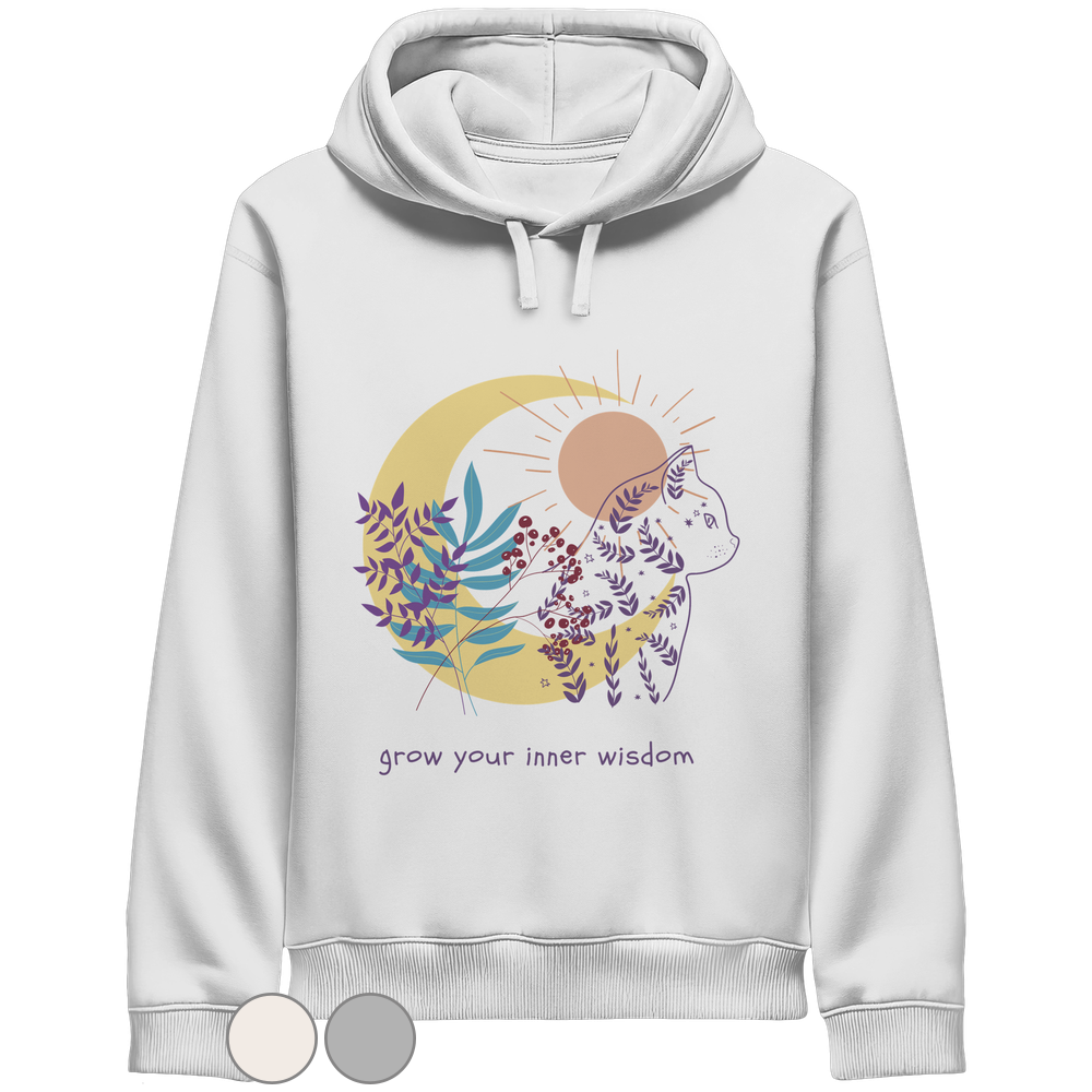 Der Katzen Hoodie Damen spirituell „Grow Your Inner Wisdom“ von LEODIN Design verbindet die ruhige Ausstrahlung von Katzen mit der Welt der Achtsamkeit und inneren Balance.
